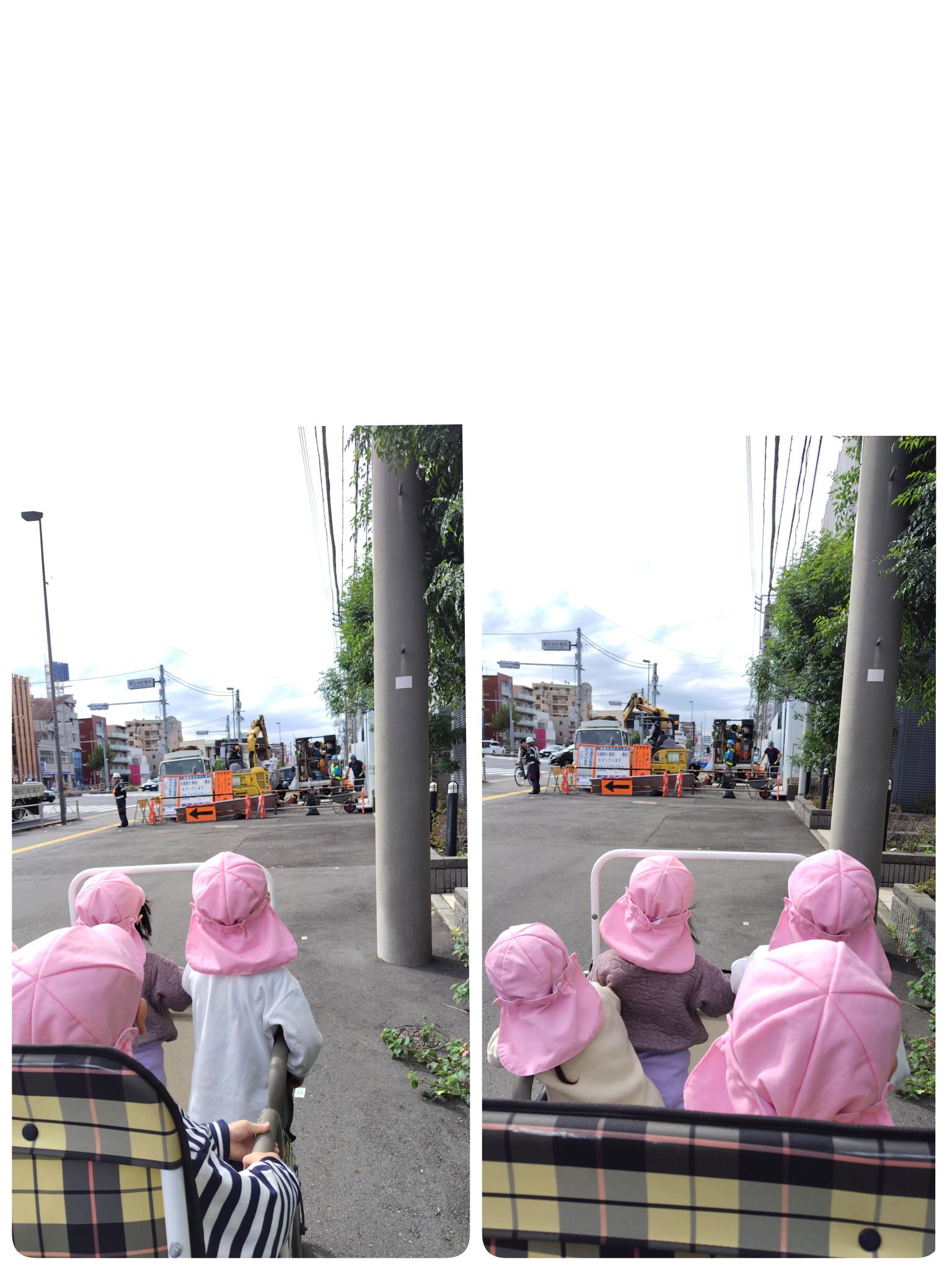 ②見付けた際には指差して友だちや保育者に発見したものを伝えようとする姿がありましたが、近くを通り過ぎる際にはじっと黙って、真剣な表情で工事をする様子を見入っていました。