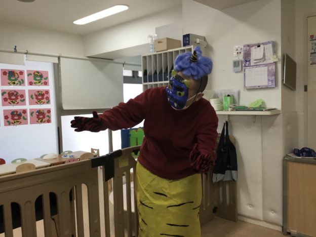 0~1歳児クラスはお面を外して怖くなり過ぎないようになど配慮して、行事を楽しむようにしました。