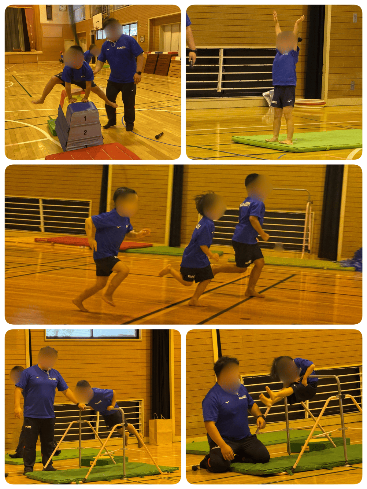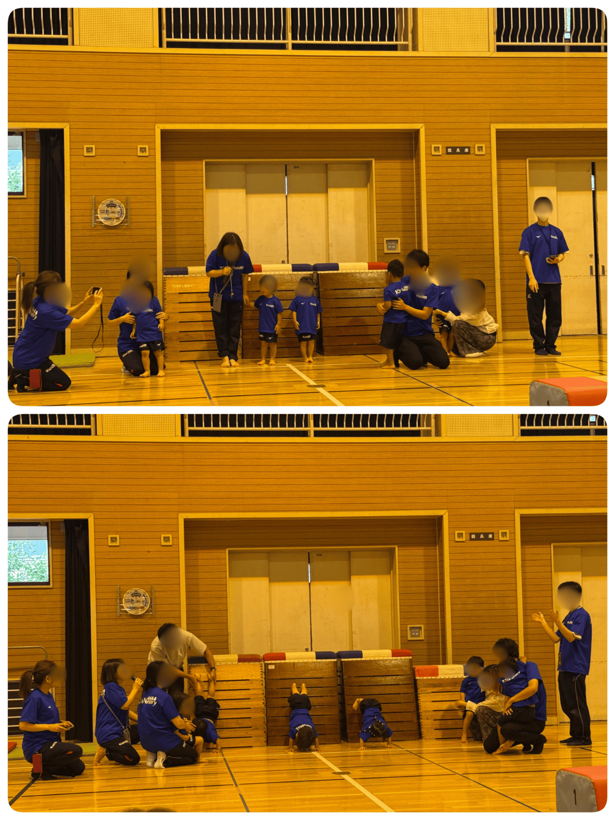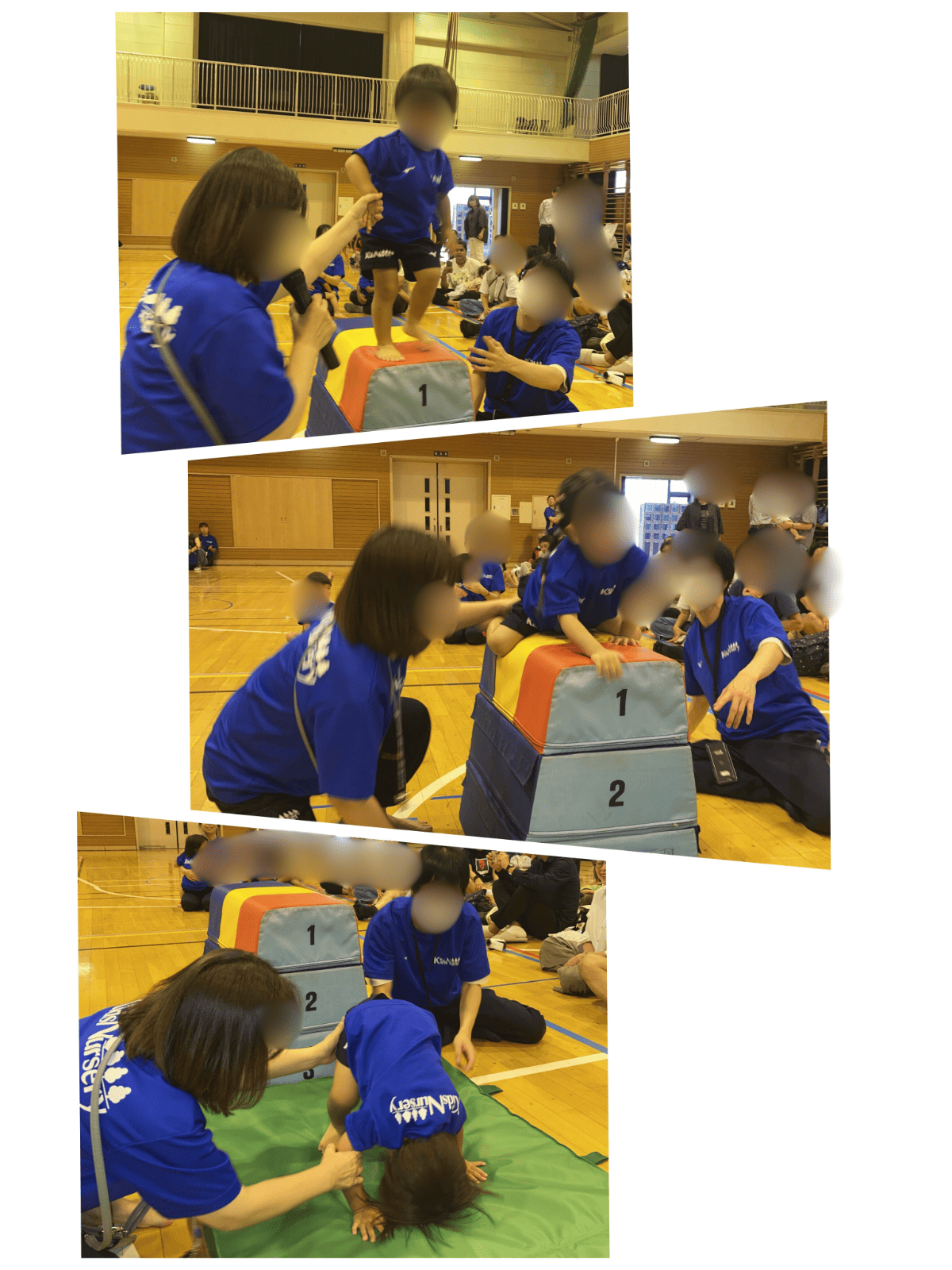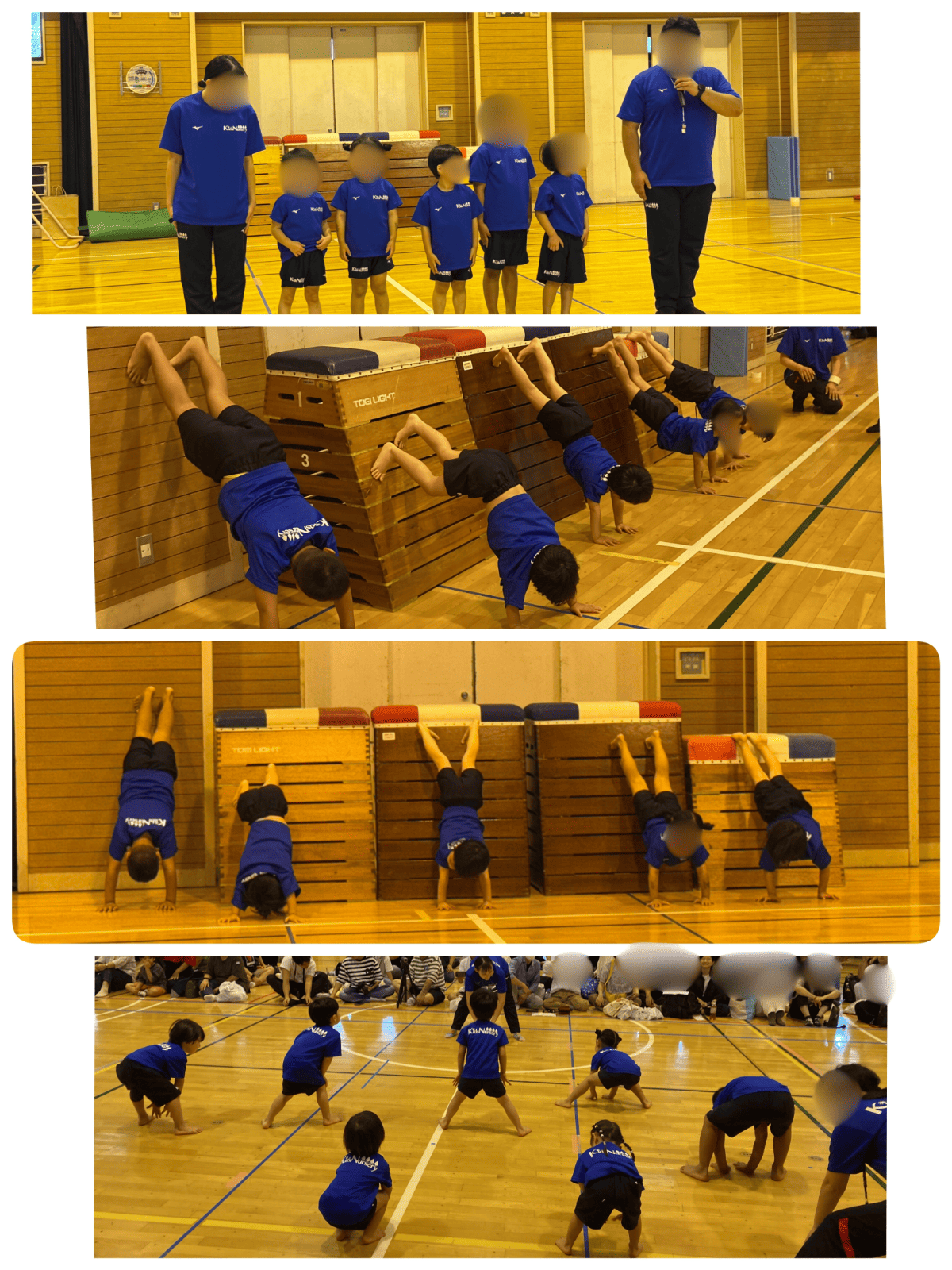 競技はかけっこから始まり、ヨコミネ式体操として「マットでの前転」「足掛け倒立」鉄棒での「足抜きor前回り」「ブリッジ」「跳箱」を行い、最後にダンスを披露してくれました。