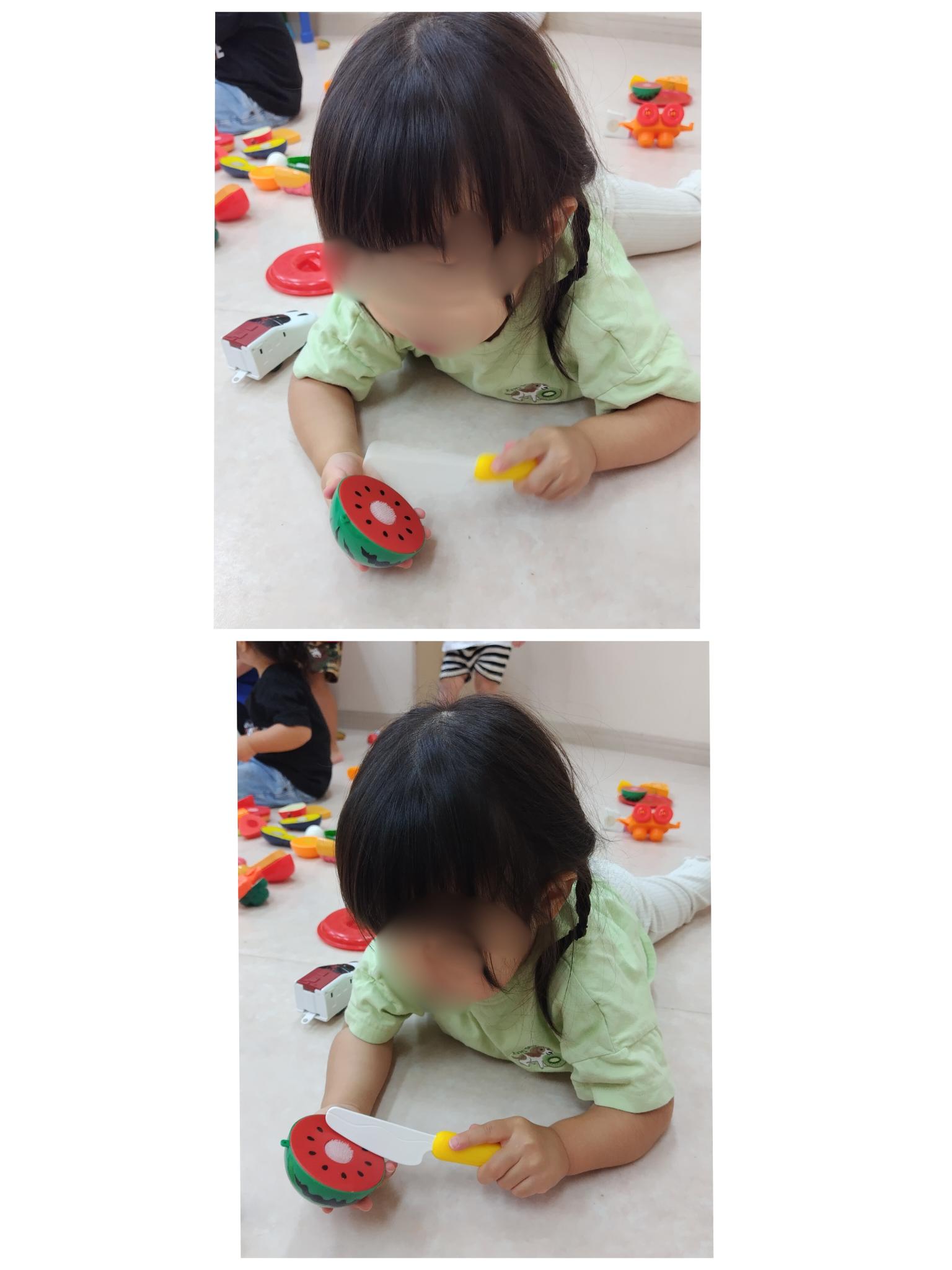 ②ままごと遊びのナイフを弾くと細かく跳ね返るのに気付き、感触を確かめていましたが、スイカのおもちゃを叩くと小さく「コンコン」と音が鳴るのに気付き、音を確かめる姿がありました。