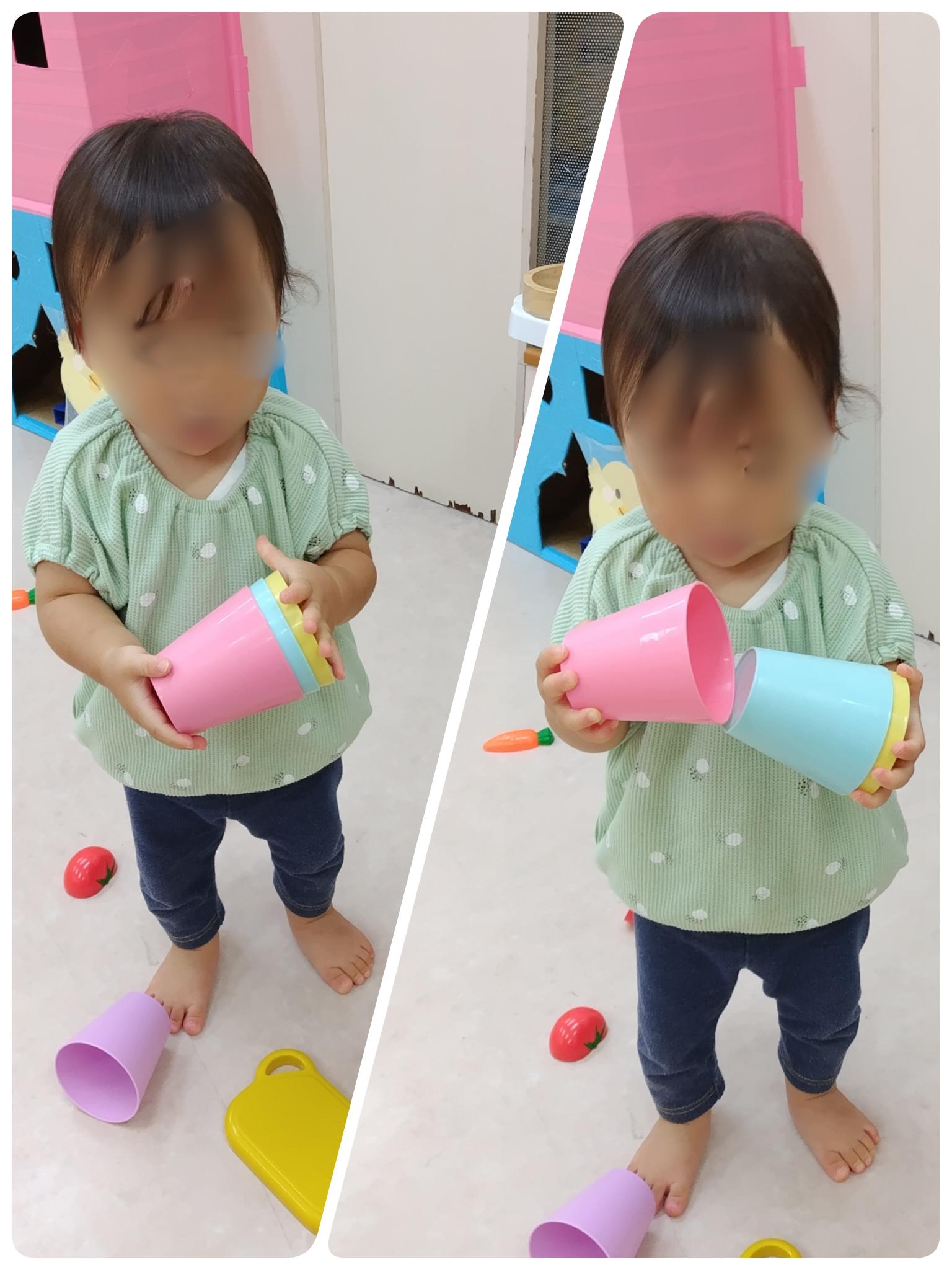 重ねて遊ぶ姿も見られますが、主にコップをぶつけて音を出し楽しんでいました。