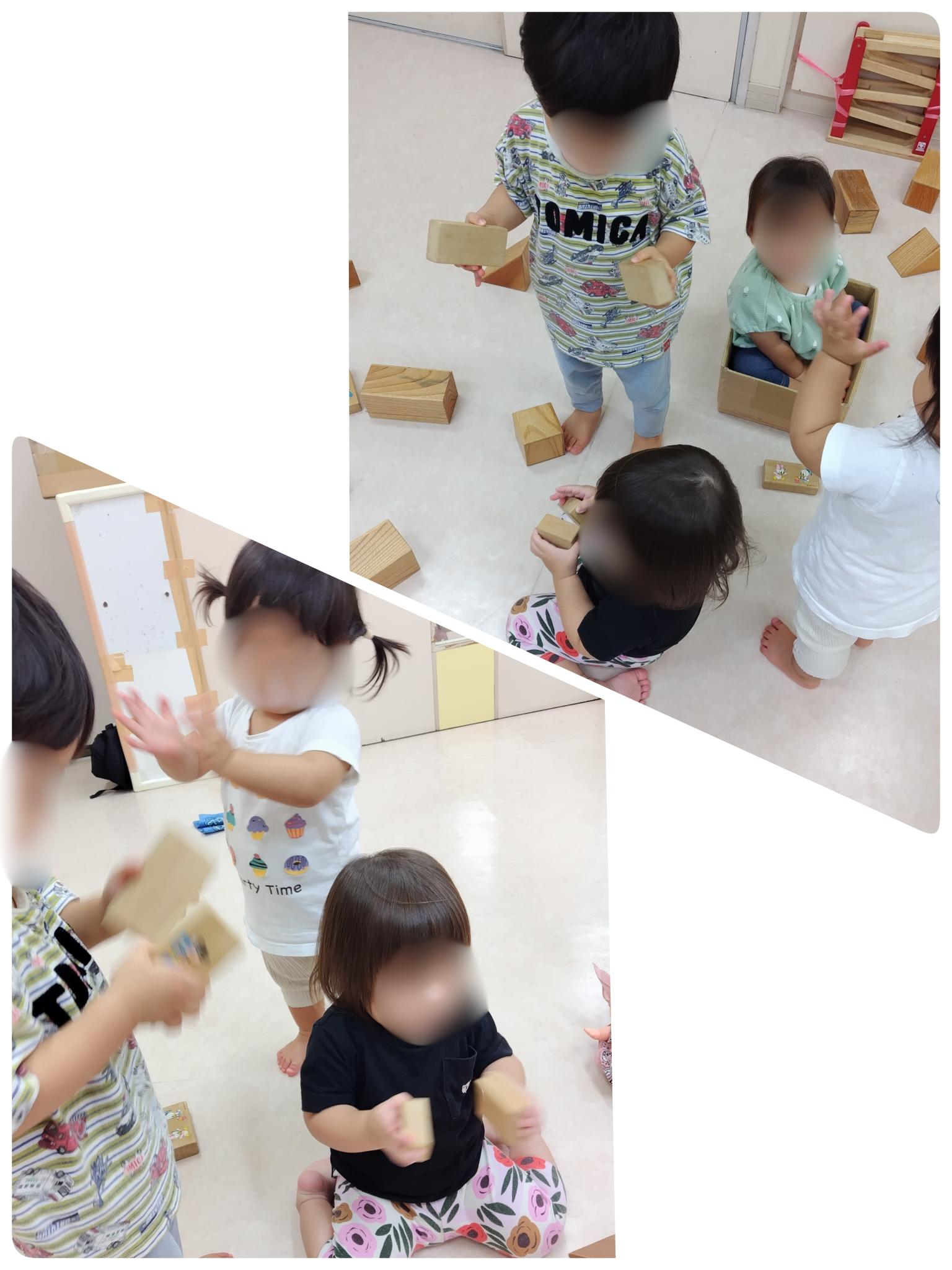 ①積木で遊んていた際に、1人の子が両手に積木を持ち、それを叩き合わせることで「コンコン」といった軽くて高い音がするのに気が付きました。