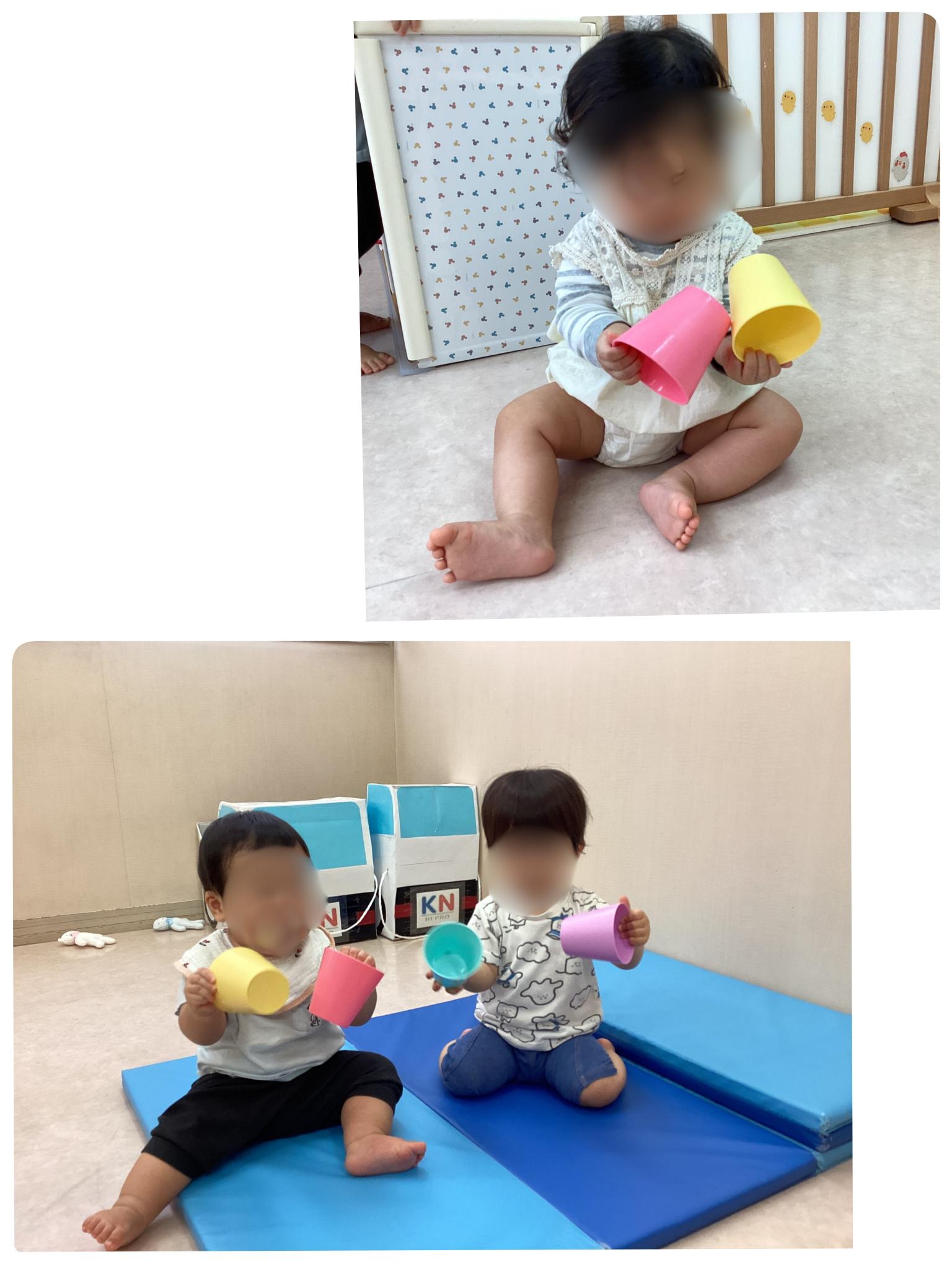 ①コップはコップとして遊ぶことはなく、両手に持って打ち鳴らすのが子どもたちの遊び方です。