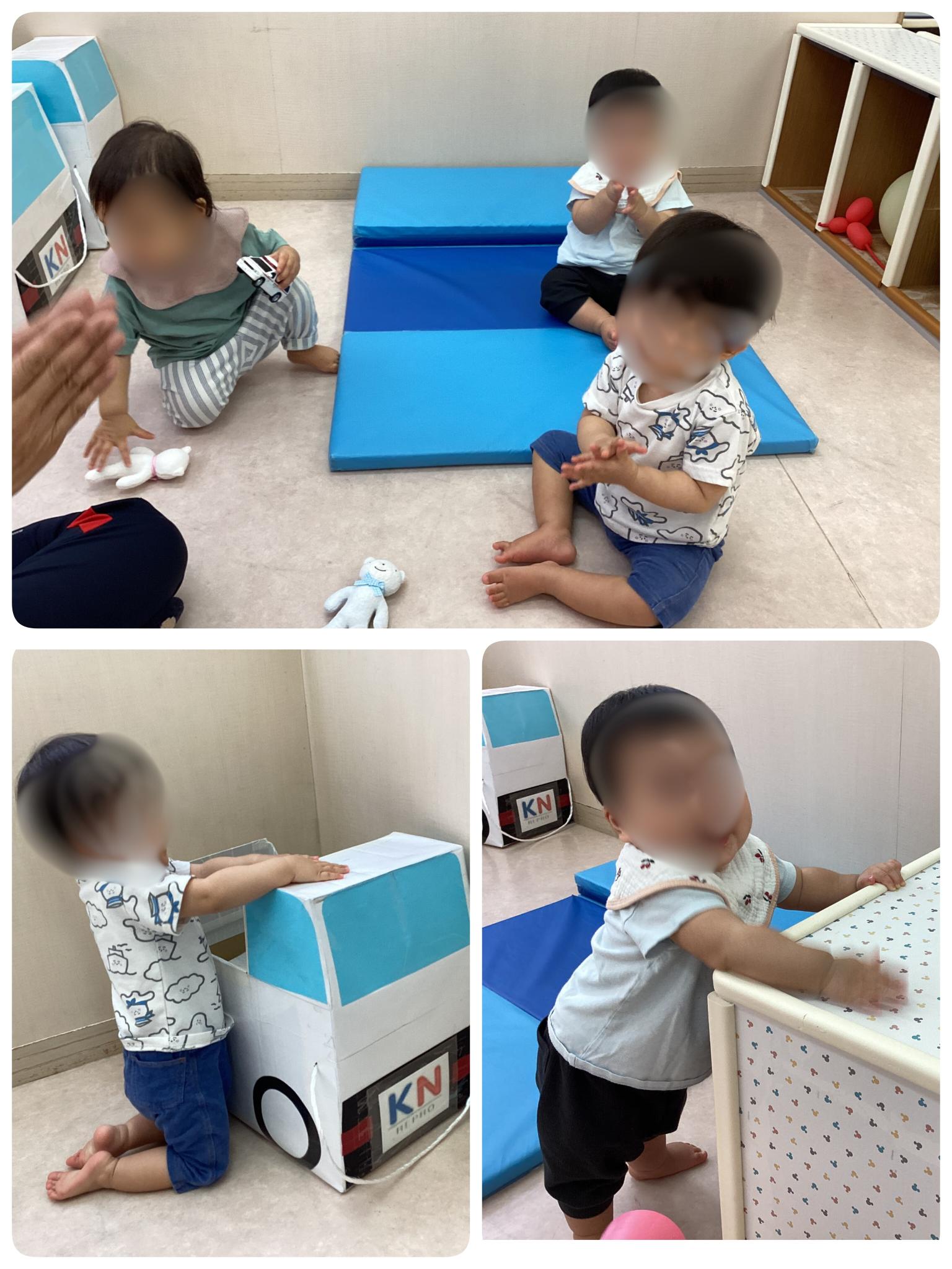 また、棚につかまり立ちをした際、棚をたたくと音が出ることを発見し、楽しそうにたたく姿が見られました。月齢の低い(6か月程度)子どもも楽しんで行っていました。